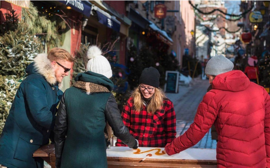 Winter carnivals followed after Christmas, continuing throughout the pre-Lenten season. With hunting and ice fishing competitions, canoe racing across icy rivers (a mix of paddling and foot races over icy hazards), snowshoe races, snow sculpturing the cold and isolation of winter was tamed. Come Spring’s warming, ‘sugaring’ season began, with harvesting of maple sap to be boiled down to rich syrup. Hot syrup, hardened over snow into taffy or poured over grill cakes with beans, was celebrated in winter’s snows.