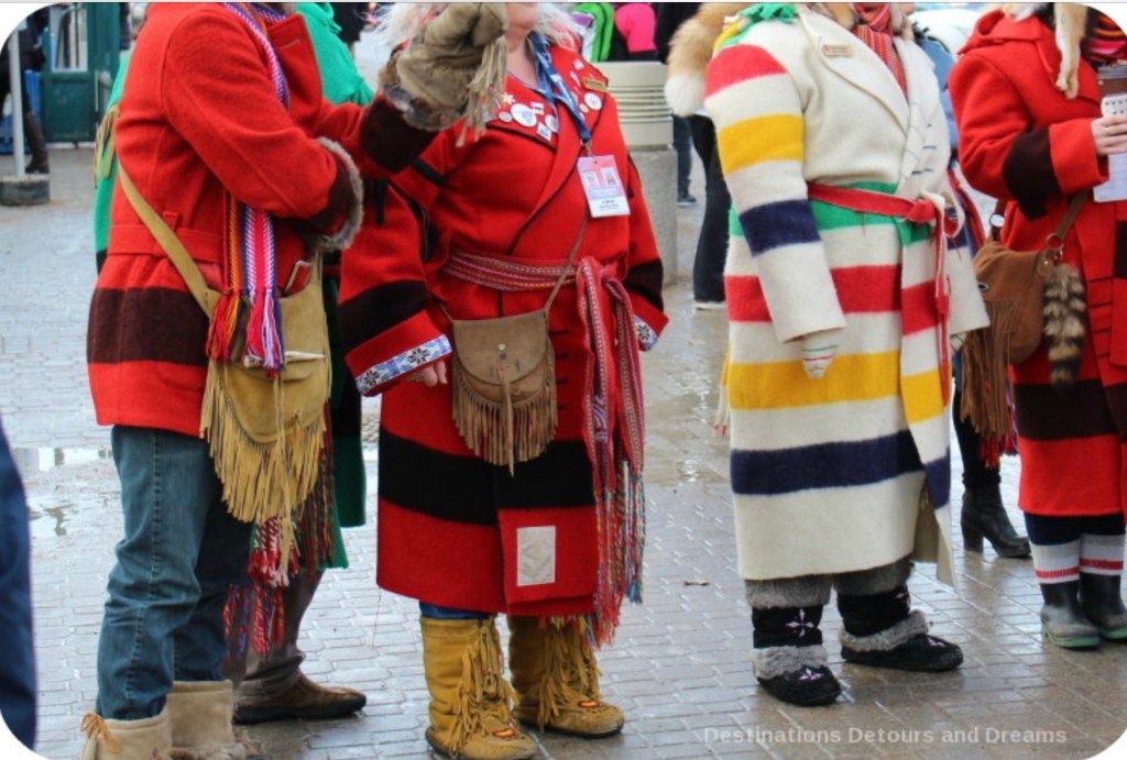 The Canadian climate was vastly different from the milder France, but the open-minded settlers adapted clothing and lifestyle to that of the Indigenous people, dressing warmly in mukluks, furs and warm knitted tuques, mitts and scarfs. Colour was vibrant, if only to prevent being mistaken for game in the bush.