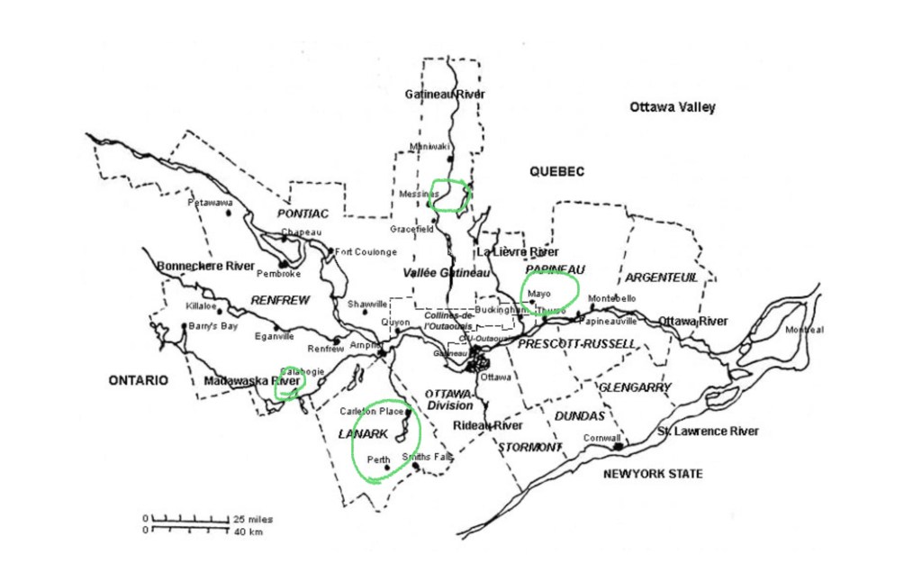 Figure 6 : Peter Robinson Settlement (shaded in green) of Bathurst District of Upper Canada, 1823. Red dots mark Military Settlement Towns of Lanark, Perth and Richmond.